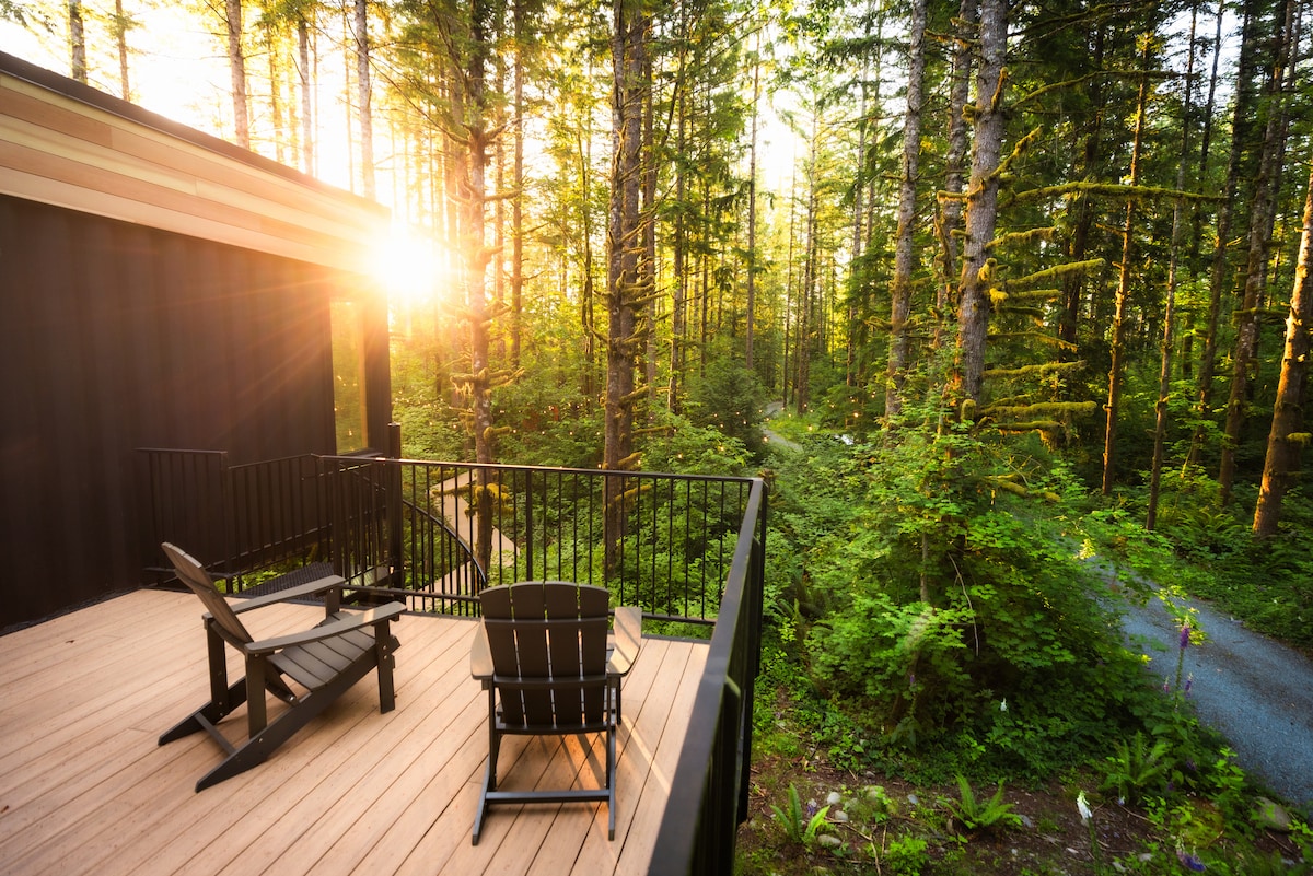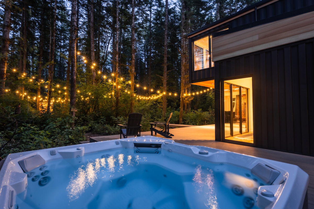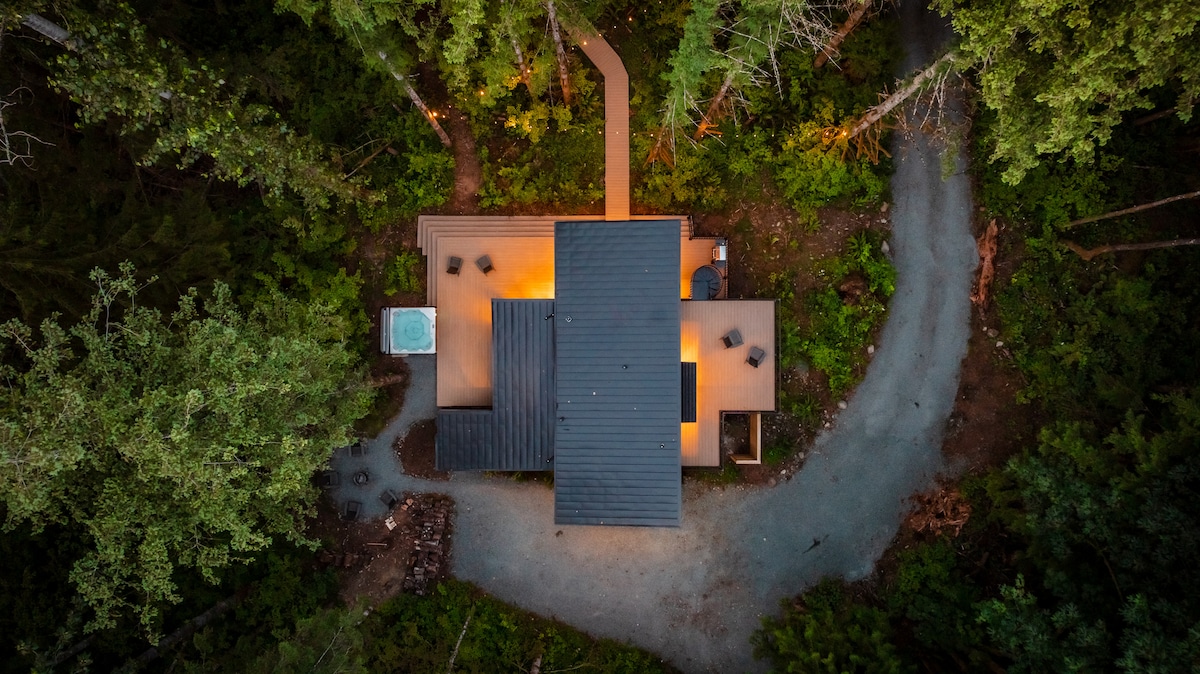 The home includes a private hot tub, forest-surrounded bedrooms, a steam shower, upper/lower deck space, private hiking trails and fire pit.