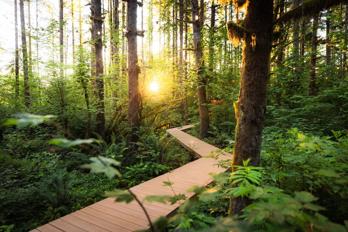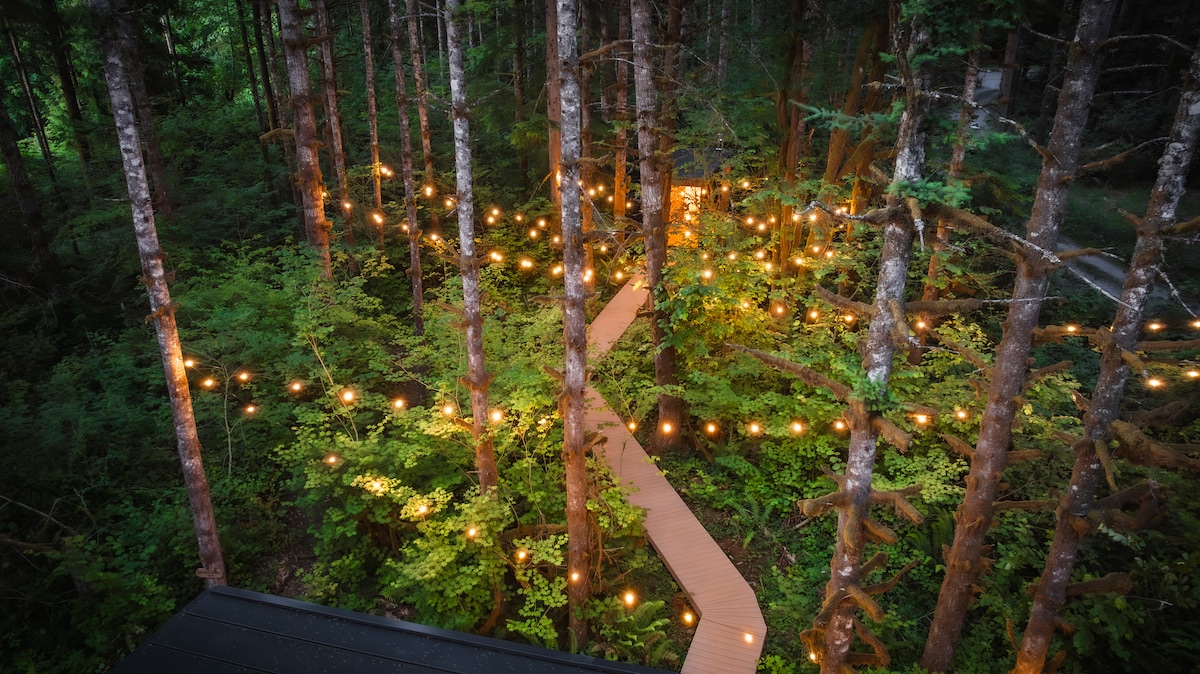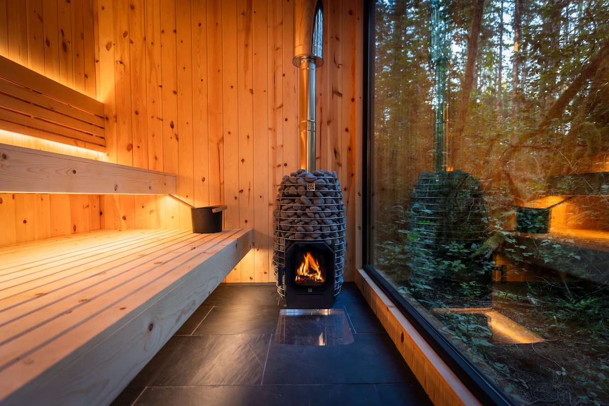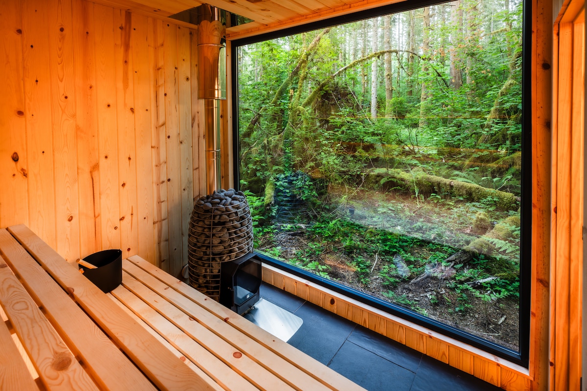 The home includes a private hot tub, forest-surrounded bedrooms, a steam shower, upper/lower deck space, private hiking trails and fire pit.